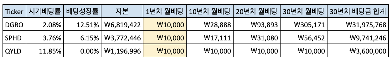 유형이 다른 3개의 배당 ETF를 기준으로 월배당 만원을 받기 위해 필요한 자본의 크기를 계산해 보았다.