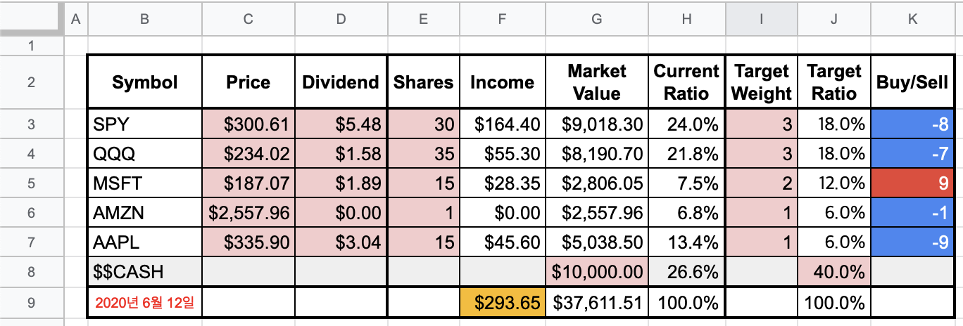 - 마이크로소프트가 앞으로 잘 될 것 같아서 SPY, QQQ, MSFT, AMZN, AAPL 종목 간 비중을 3:3:2:1:1로 조정 (I열)
