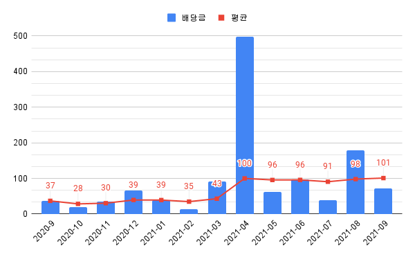 2021년 9월엔 세후 71.5만원의 배당금을 수령했다. 작년 같은달의 배당금은 37만원이었으니 1년 사이에 거의 2배로 증가했다.