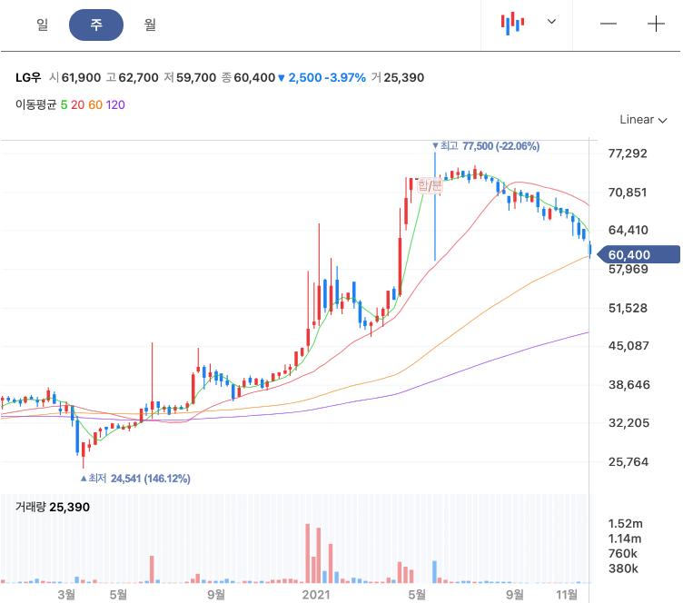LG우를 처음 발견했을 때 배당률은 4.3% 정도 였던 것으로 기억한다. LX와 분할 직전 거의 10만원까지 주가가 올라가면서 배당률은 2%대로 떨어져서 아쉬움이 컸는데, 11월 마지막 날 배당률은 4.3%를 돌파했다. 12월 1일 종가는 60,400원. 내년 4월 배당금이 2,850원으로 상향된다면 배당률은 4.7%, 3,050원으로 상향된다면 배당률은 5%가 된다.
