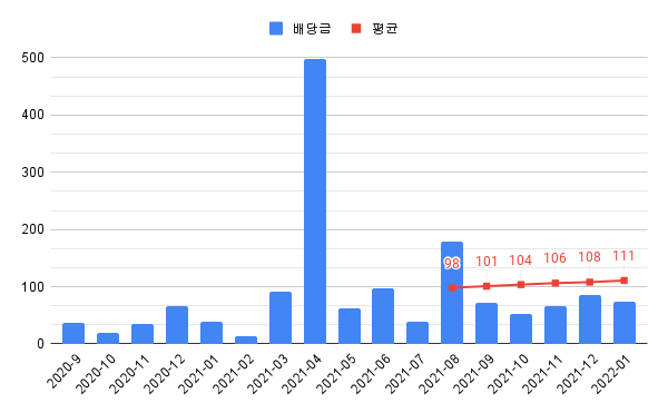 2022년 1월 세후 배당금은 74.2만원을 기록했고, 최근 12개월 평균은 111만원을 기록하면서 전달보다 3만원 증가했다. 주가가 많이 빠져도 꾸준히 배당주를 사모으면 배당금은 우상향을 이어갈 수 있다.