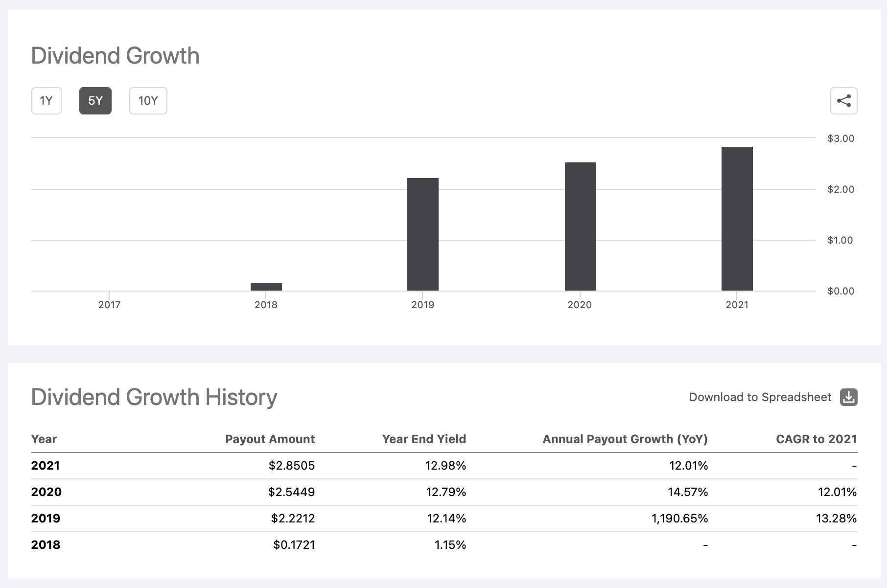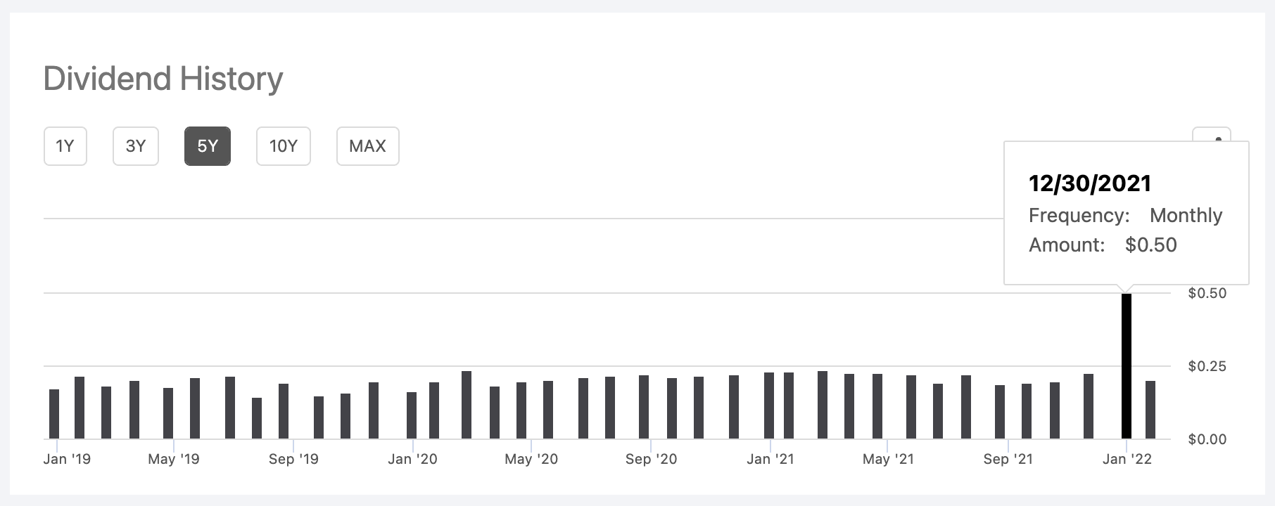 이번달의 주인공은 QYLD. 시가배당률 12%가 넘는 QYLD에 투자할 땐 배당성장은 기대하지 않았는데, 무려 12% 이상의 배당성장률을 보여주고 있다. '21년 12월에는 평소의 두 배가 넘는 폭탄 배당을 해준 덕분에 배당금 수령 시점인 '22년 1월에 좋은 기록을 남길 수 있었다.