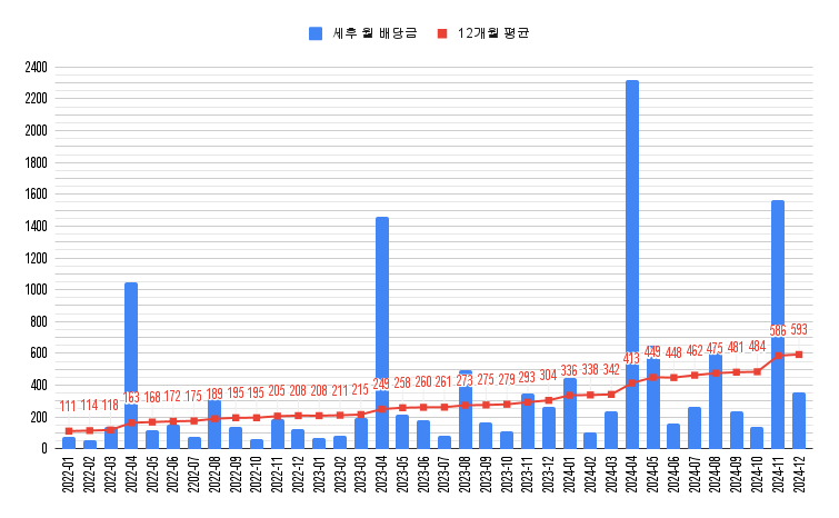 이로써 2024년의 끝에 12개월 평균 세후 월배당금은 593만원을 기록했다.