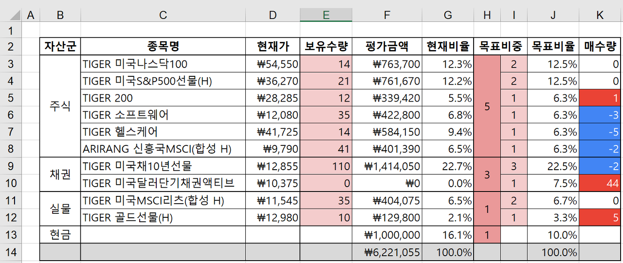 목표비중 자산군,종목명,종목코드,현재가,등락률,보유수량,평가금액,현재비율,목표비중,목표비율,매수량 주식,TIGER 미국나스닥100,133690,₩59,350,0.24%,15,₩890,250,55.1%,13.0%,5,2,12.5%,-1 TIGER 미국S&P500선