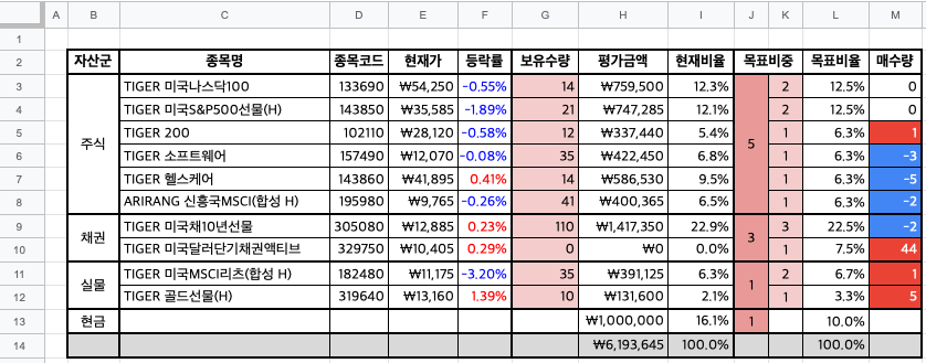 - 자산군 간의 목표비중(J열)과 자산군 내에서 종목 간의 목표비중(K열)을 입력하면, 목표비율(L열)과 매수량(M열)을 확인할 수 있다.
