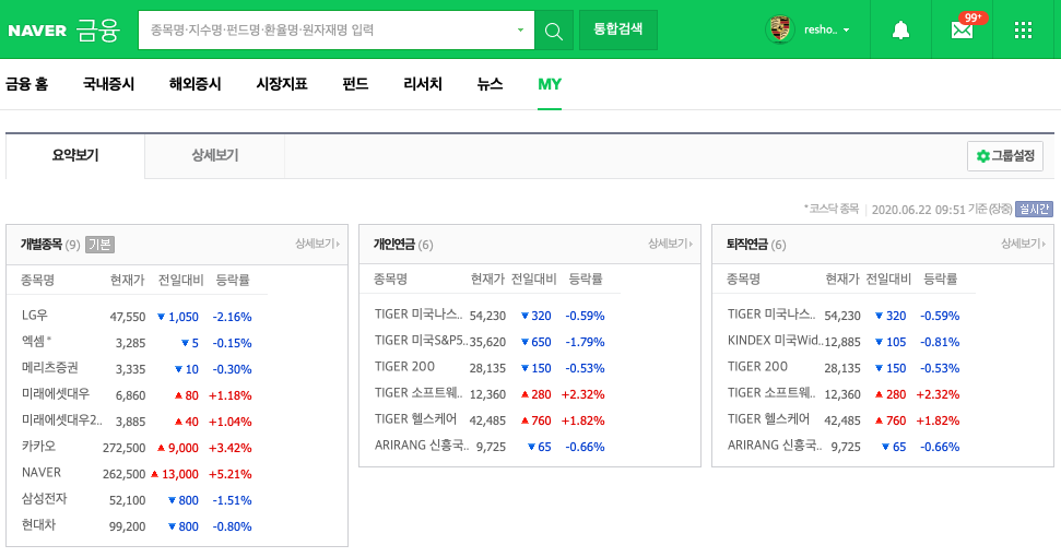네이버 금융에 관심종목을 등록해놓고 요약보기를 하면 포트폴리오 구성종목의 현재가를 한 눈에 파악할 수 있다.