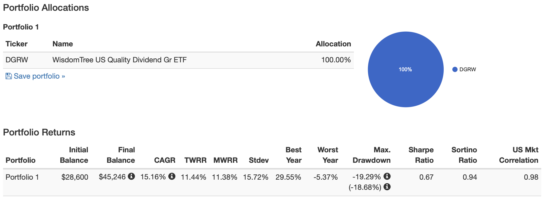 그 때 만약 차를 바꾸지 않고 그 돈으로 지금 투자하고 있는 미국 월배당성장 ETF DGRW를 매수했다면 어떻게 되었을까? Portfolio Visualizer로 계산해봤다.