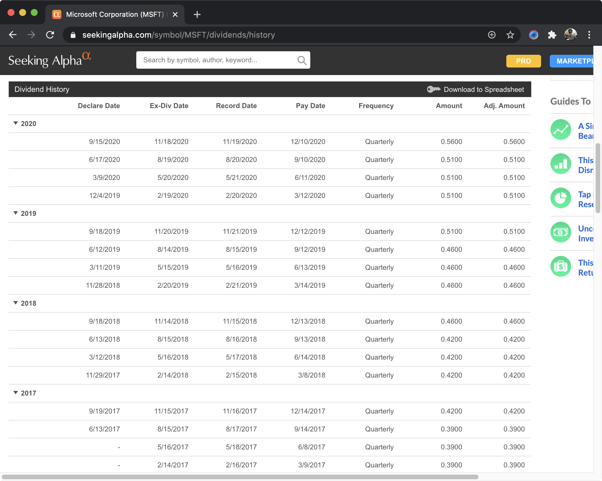 seekingalpha.com에 접속하여 주식 또는 ETF의 이름(e.g., Microsoft) 또는 Ticker(e.g., MSFT)를 입력하면,