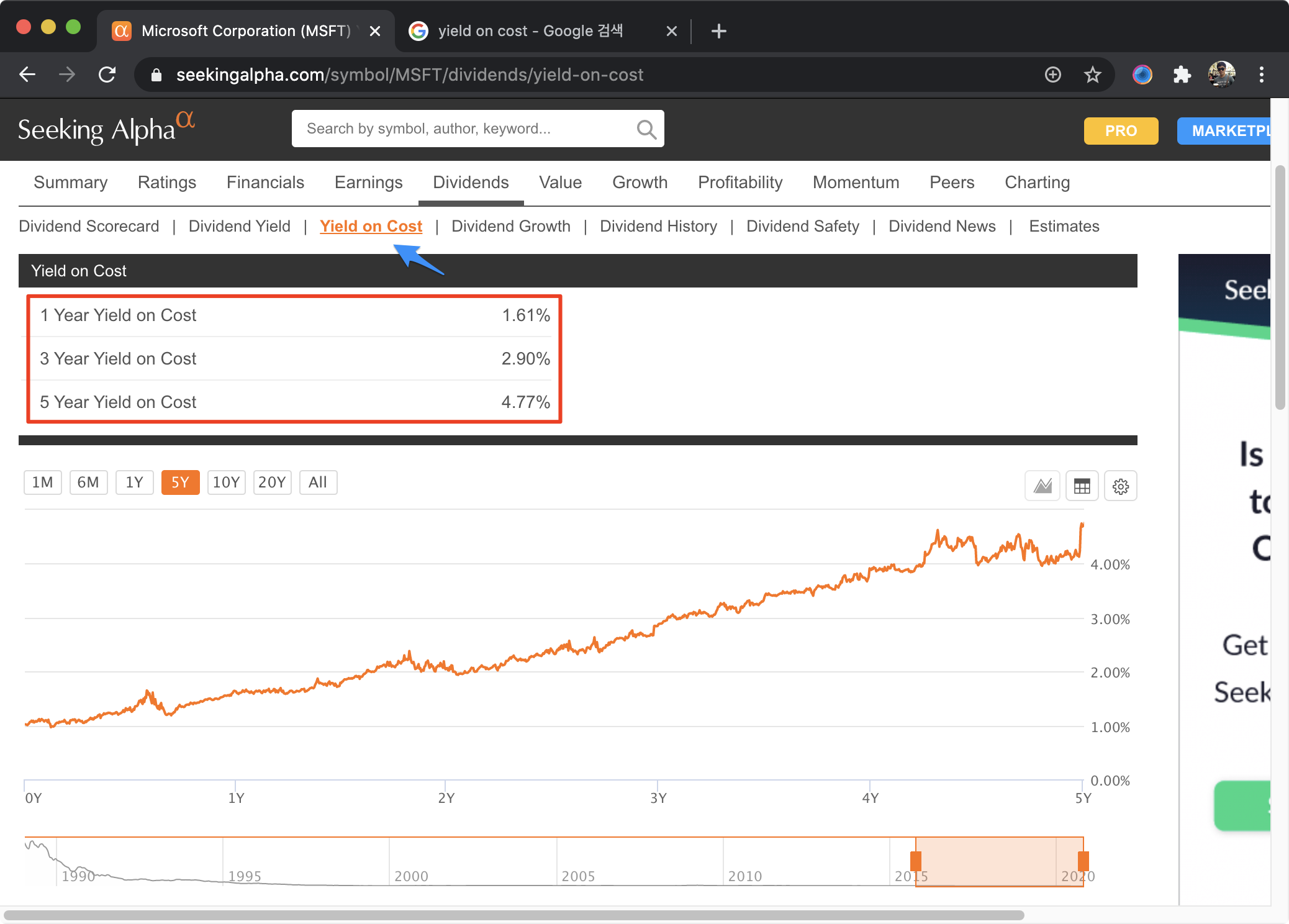 배당 성장이 이루어지는 주식을 오래전에 사 두었다면, 배당률은 시간이 흐를수록 높아진다. 5년전에 마이크로소프트 주식을 사 두었다면 현재 투자 배당률은 4.77%에 이르는 것을 알 수 있다.