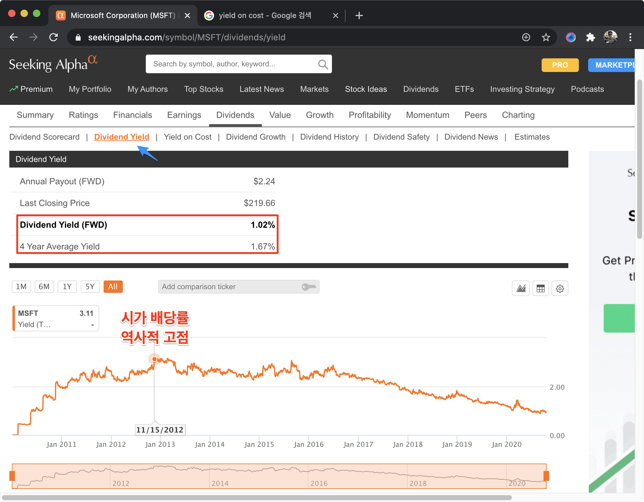 Dividends > Dividend Yield 탭에선 시가 배당률의 이력을 확인할 수 있다.