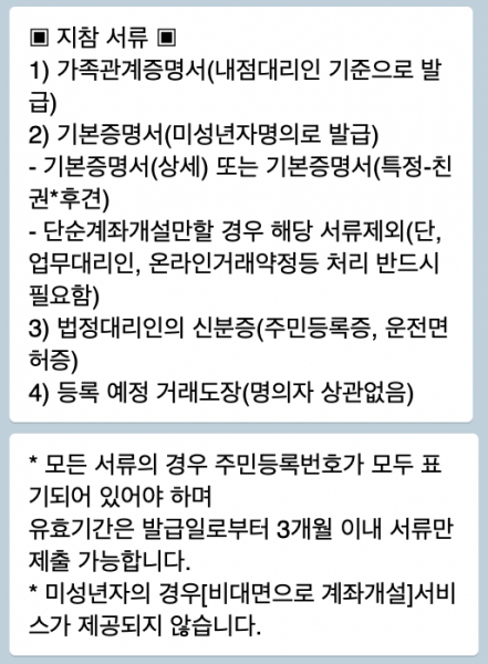 자녀 명의의 증권사 계좌는 기본증명서와 가족관계증명서만 있으면 영업점을 방문하여 개설할 수 있다. 가족관계증명서는 온라인으로 발급 가능하지만, 기본증명서를 발급 받으려면 주민센터에 다녀와야 한다.