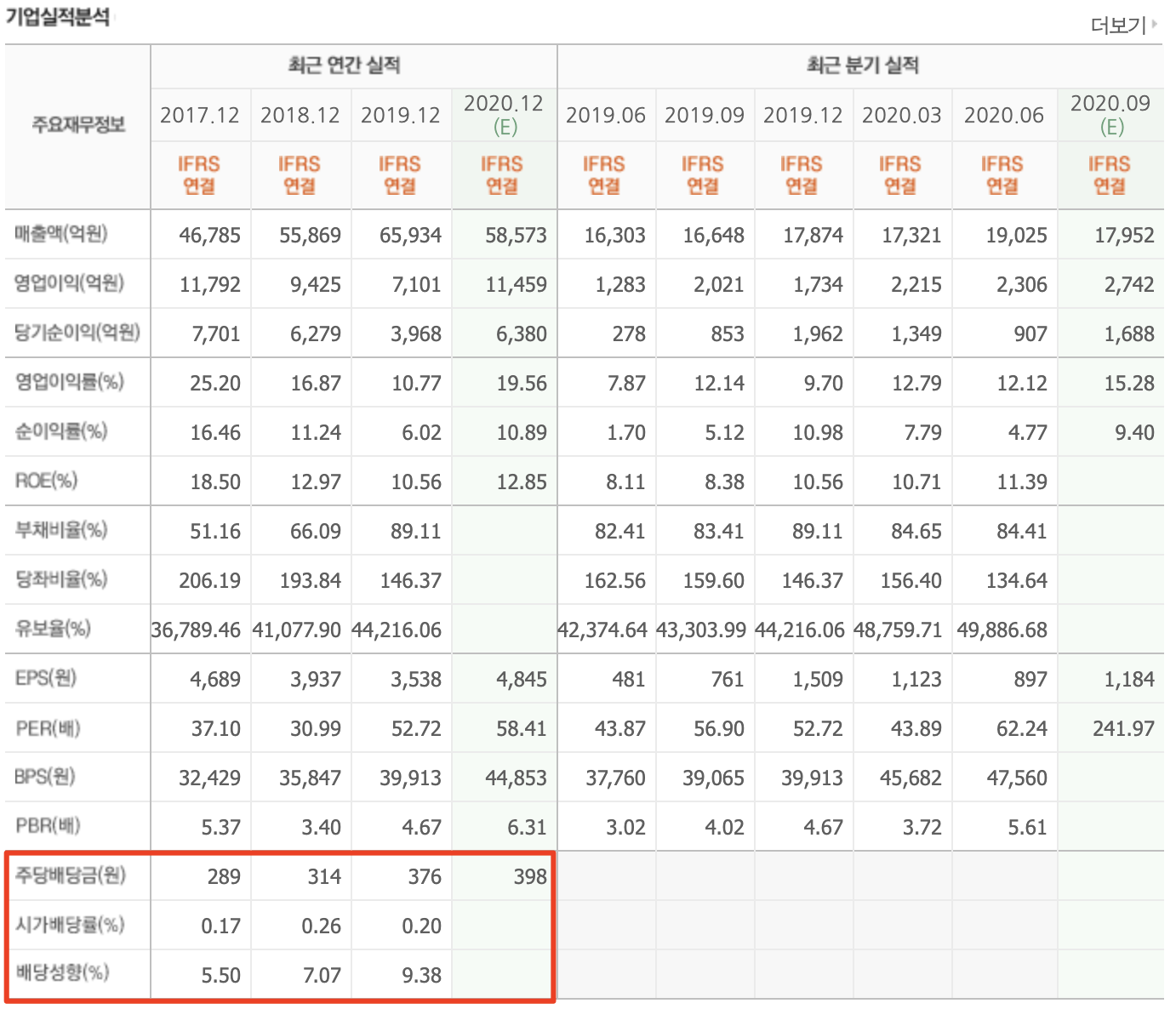 스크롤을 내려보면 나오는 기업실적분석 표 하단에 배당금, 시가배당률, 배당성향을 확인할 수 있다. 지금까지 나온 실적과 남은 분기의 예상실적과 배당성향을 고려하여 내년 배당금의 예상치도 제공하고 있다. 보수적으로(낮게) 계산하는 경향이 있는 것 같다.