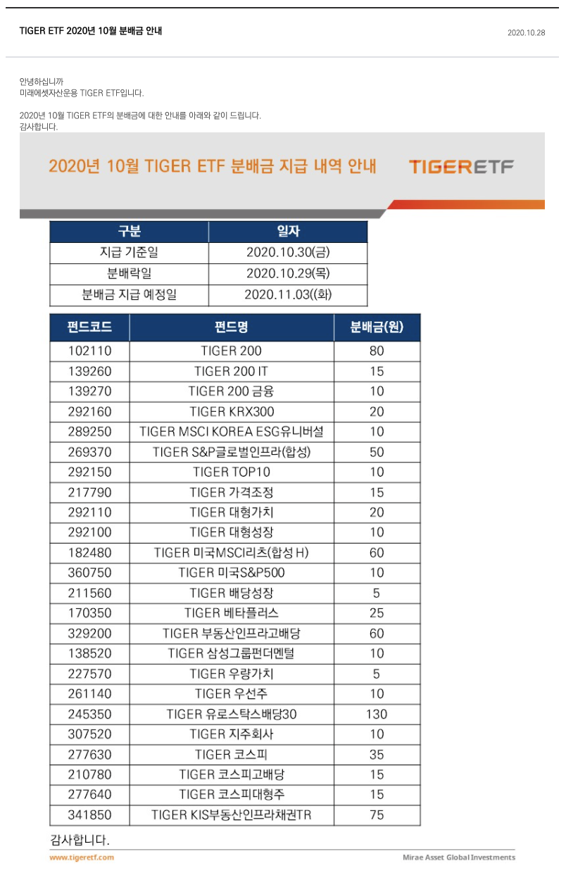 | TIGER 미국S&P500, TIGER TOP10 ETF 분배금 지급 (2020-11-3, 주당 10원?) (0) | 2020.11.03 |