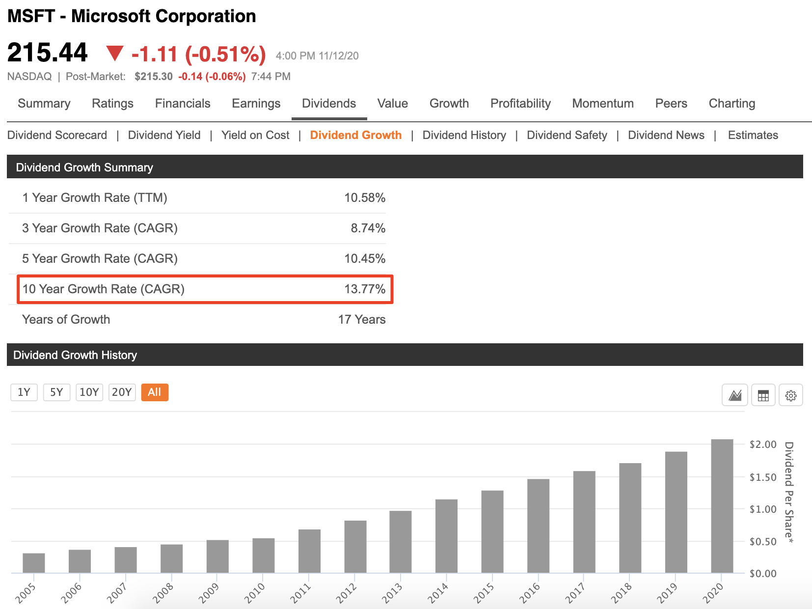 참고로 마이크로소프트의 지난 10년 연평균 배당성장률은 13.77%다.