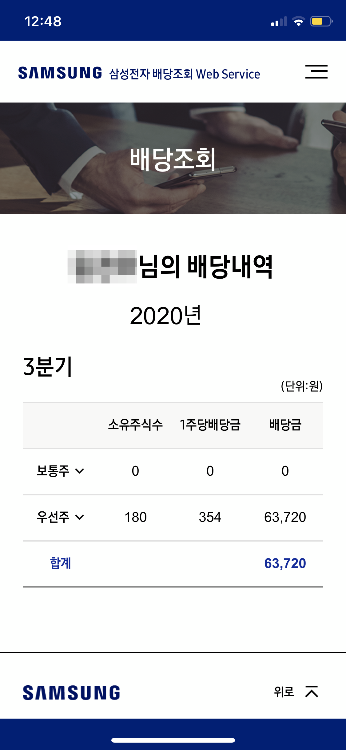 드디어 오늘(2020. 11. 13.) 삼성전자 배당조회 웹 서비스가 오픈 되어서 배당금 지급일보다 일찍 배당금을 확인할 수 있었다.