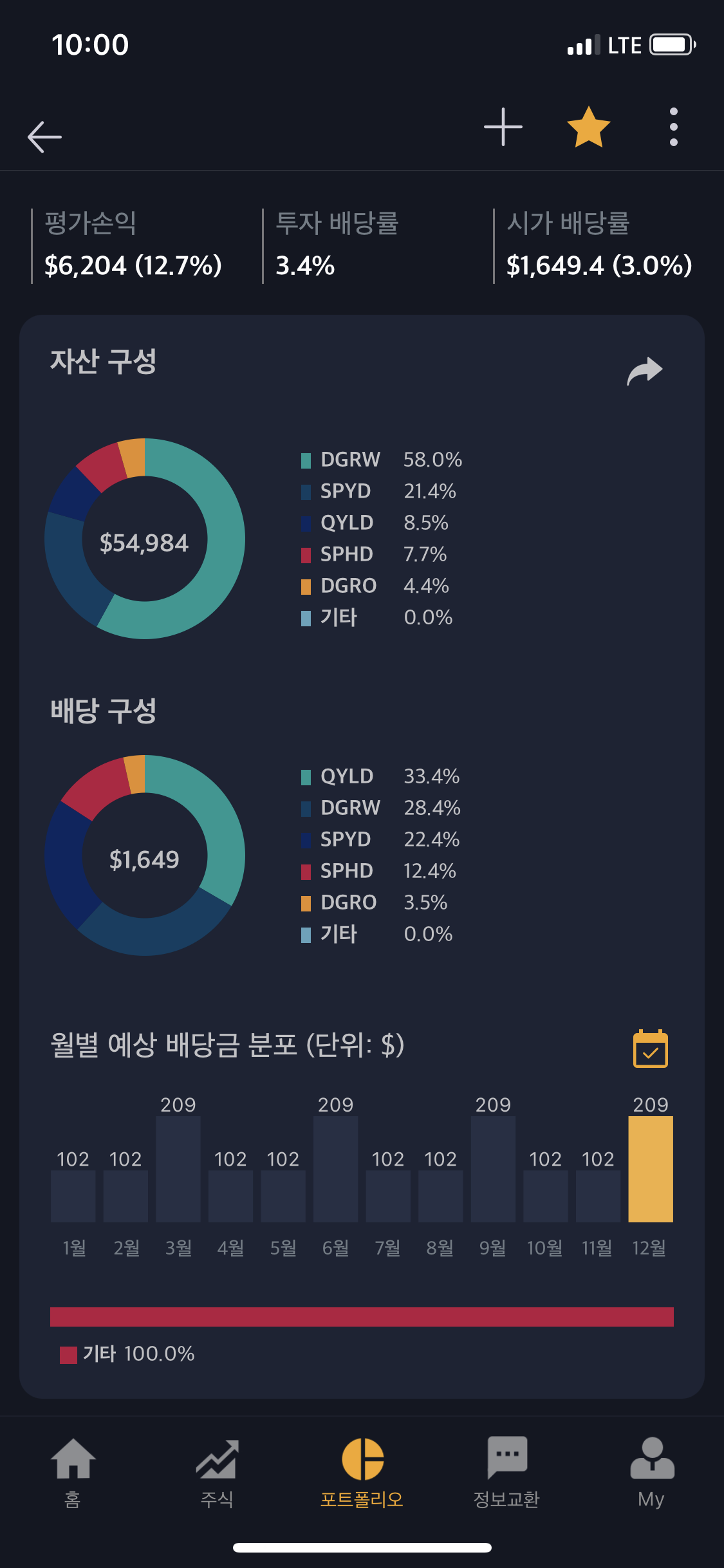 개별종목 투자는 어렵고 손이 많이 간다. 저 15개의 기업 중 내가 선택한 3개의 기업이 앞으로도 돈을 잘 벌어 배당을 줄 수 있을지 주기적으로 판단하려면 얼마나 골치가 아플까? 개인적으로 개별주 투자보다는 월배당 ETF DGRW(배당성장), SPHD(고배당), QYLD(커버드콜)를 동일 비중으로 투자하는 것을 추천하고 싶다.