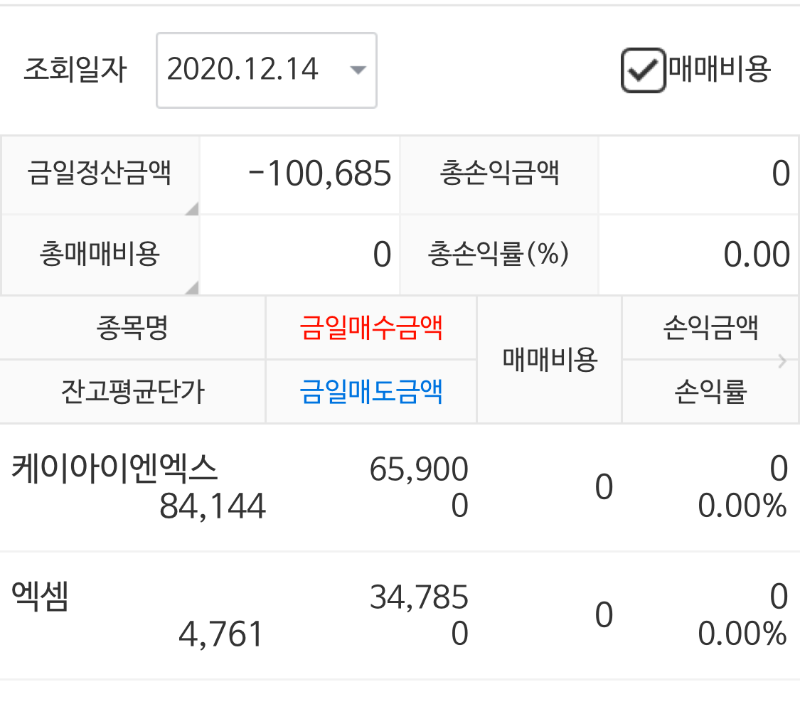 선물 받은 신세계상품권 10만원을 당근마켓에서 4% 할인해서 96,000원에 팔았고, 그렇게 확보한 현금에 계좌에 남아있던 자투리 예수금을 더해 오늘 케이아이엔엑스 1주, 엑셈 9주를 매수했다.