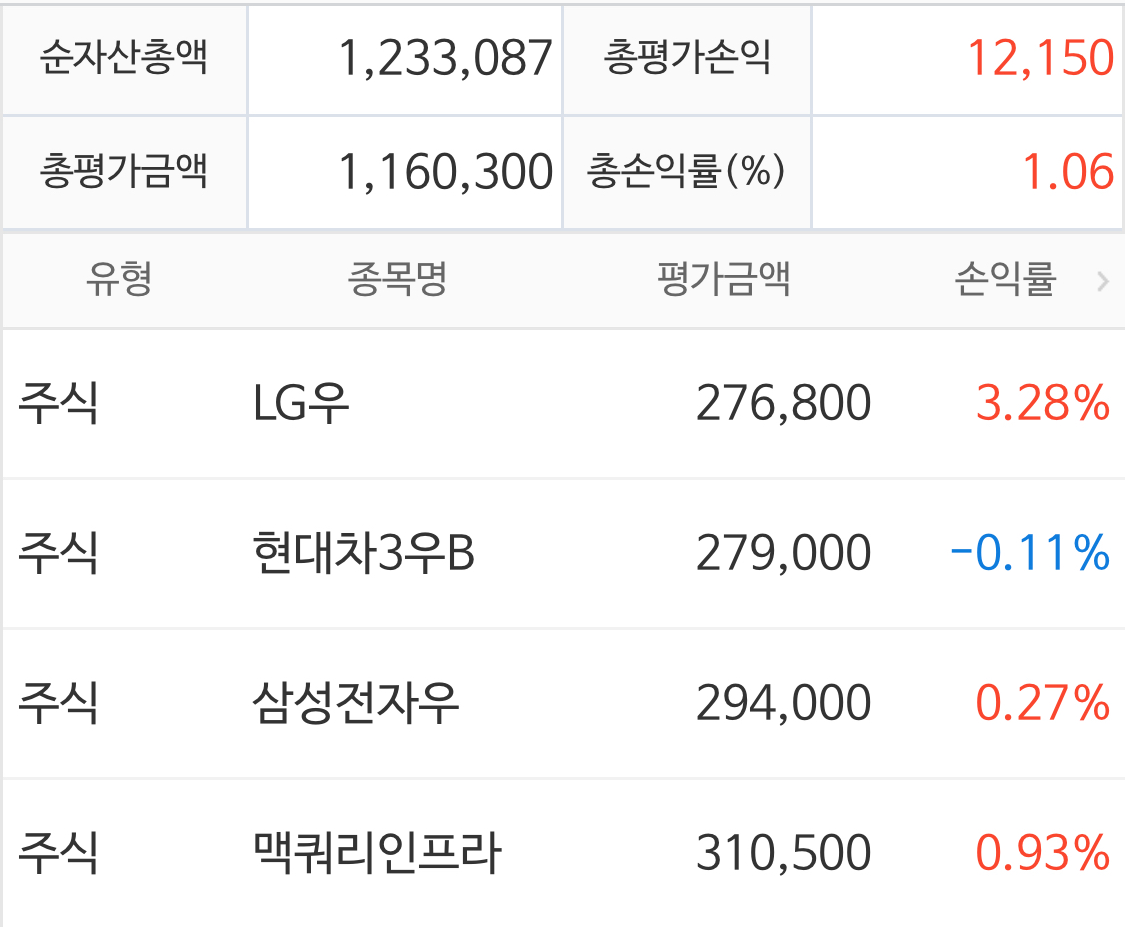 매달 25일(월급날) 투자금 입금 후 LG우, 현대차3우B, 삼성전자우, 맥쿼리인프라를 동일 비중으로 리밸런싱하는 전략이다.