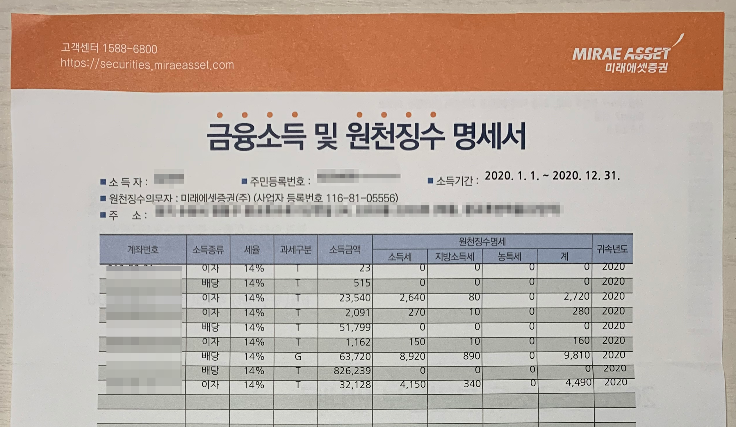 미래에셋증권에서 우편이 와서 뜯어 봤더니 금융소득 및 원천징수 명세서가 들어있었다.