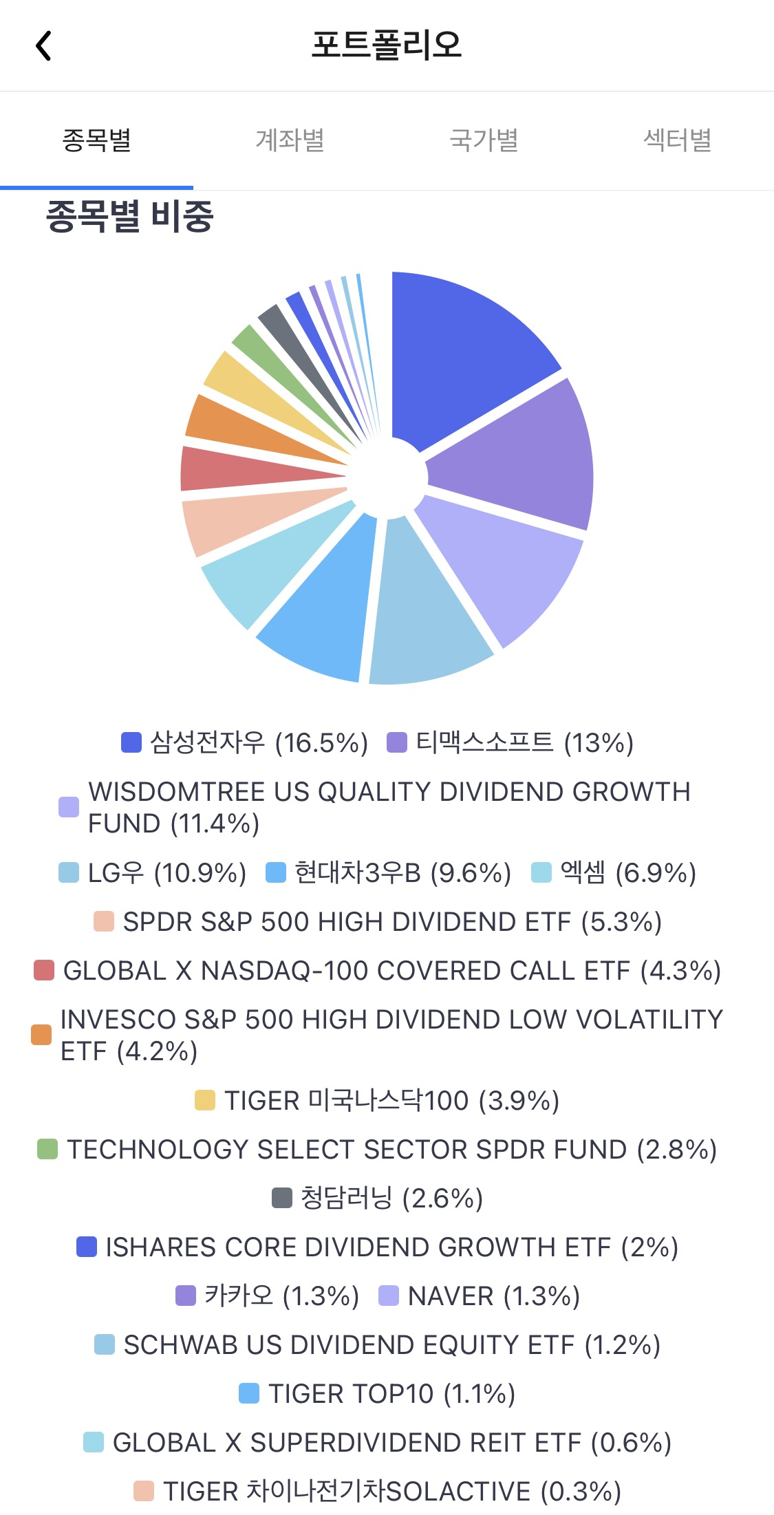 전체 계좌의 종목별 비중은 처음 확인했는데, 생각보다 티맥스소프트 비중이 높아서 놀랐다. 경제적 자유 달성을 5~10년 앞당겨줄 티맥스소프트, 엑셈의 비중을 합치면 거의 20%에 달한다. 티맥스소프트는 2007년, 엑셈은 2015년부터 보유한 종목으로 3~4년 내에 5배 이상의 시세차익을 기대하고 있다.